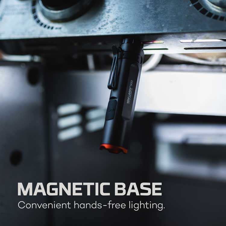 The Mini Larry is the pocket light you reach for when you need versatility. Designed with a 500 lumen LED flashlight, a 450 lumen C•O•B work light and 4 light modes, it easily adapts to any situation from spotlighting to area task lighting. Engineered for industry-leading brightness, C•O•B LED chip technology provides brilliant illumination while offering improved energy efficiency over standard LEDs. The powerful magnetic base allows you to mount the light to any metal surface for convenient, hands-free lighting. The aircraft-grade aluminum construction is impact-resistant, so it is designed to last with a bezel to protect the recessed LED and a rubber work light cover to prevent cracking, if dropped. The sturdy, steel clip allows you to easily carry this light on a belt or a pocket. Alternatively, the clip can be reversed for use as a cap light or removed for a slimmer profile. NEBO’s proprietary Smart Power Control™ creates a seamless transition through light modes to extend battery life and it is fully rechargeable via the integrated USB-C port.